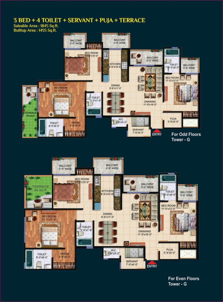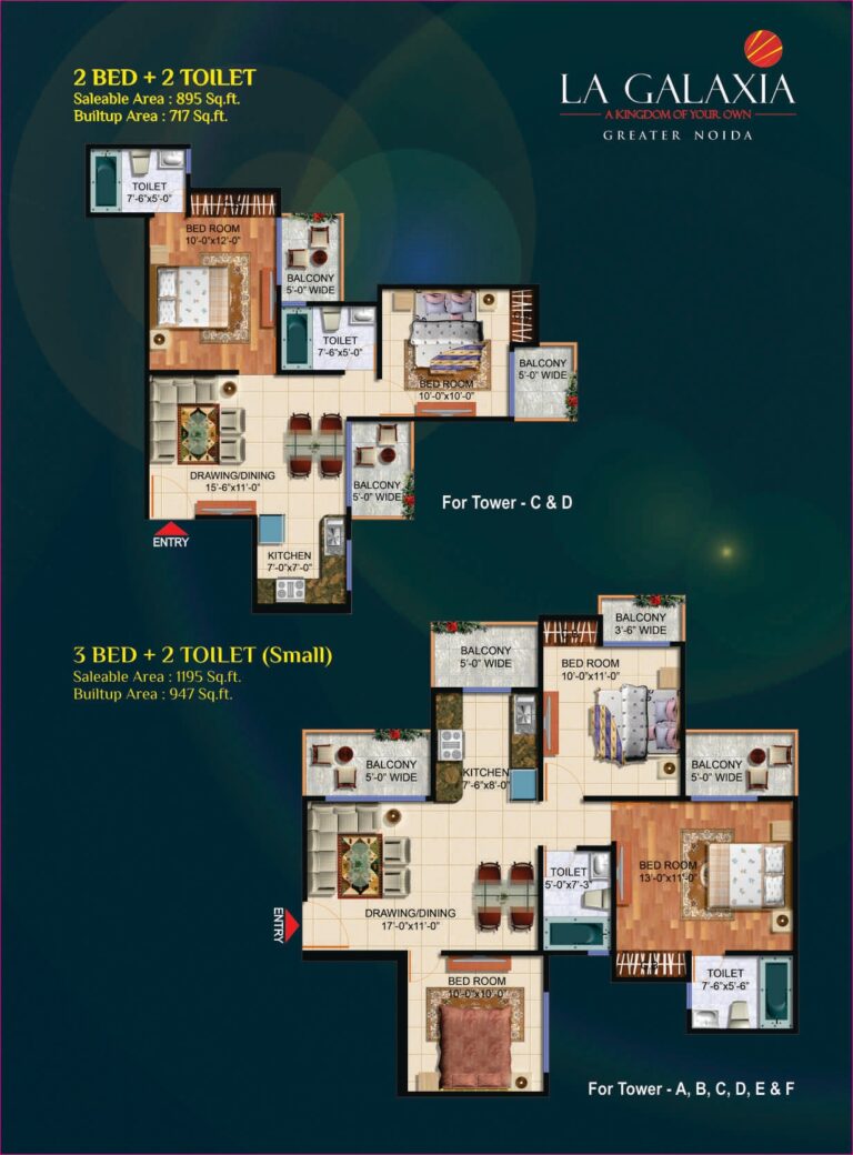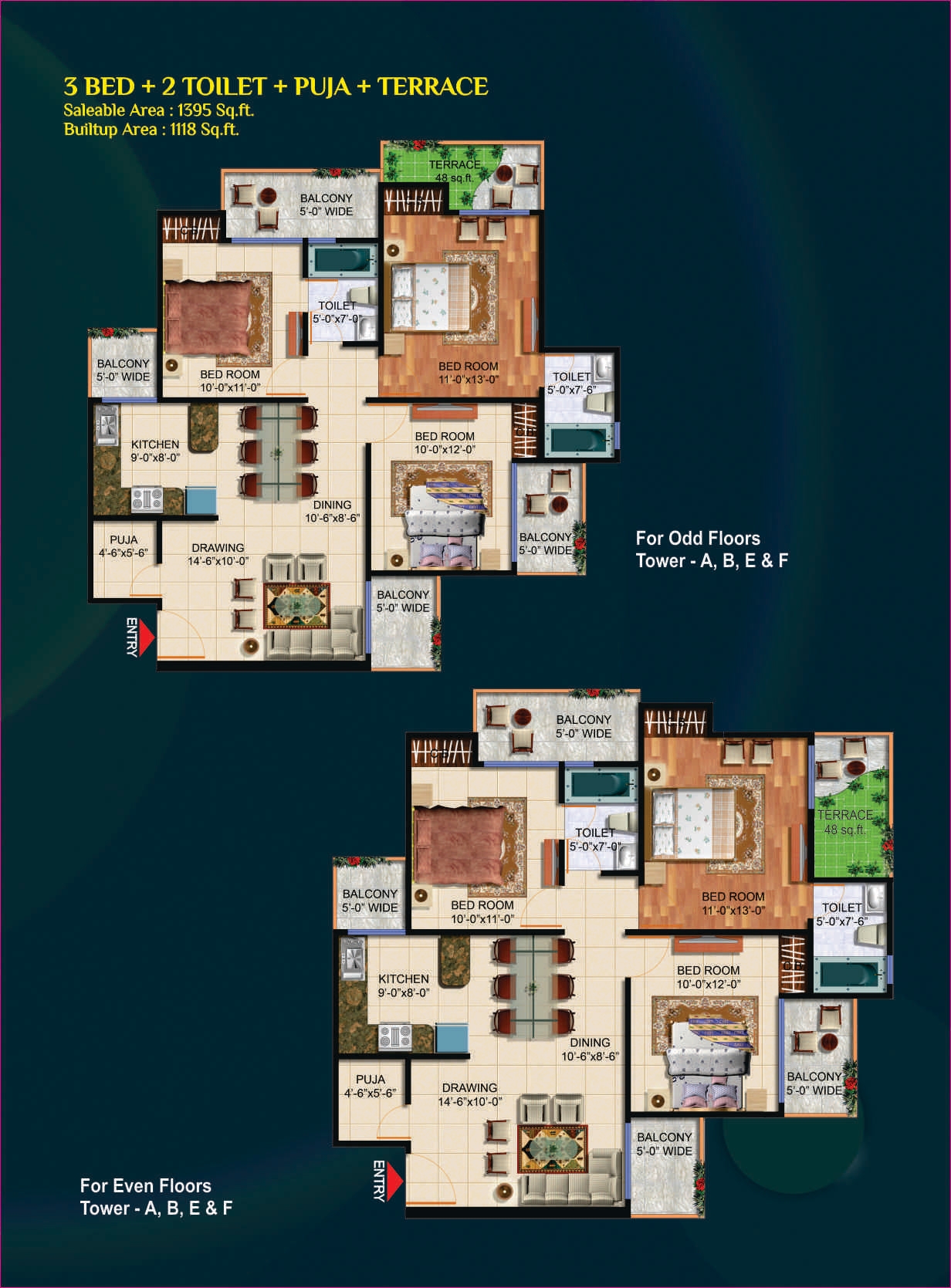 - High-Rise G+14 and G+19 storey towers with Two Level Basement and grand entrance lobby